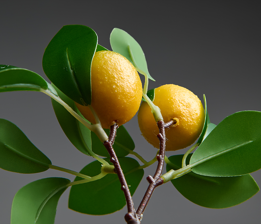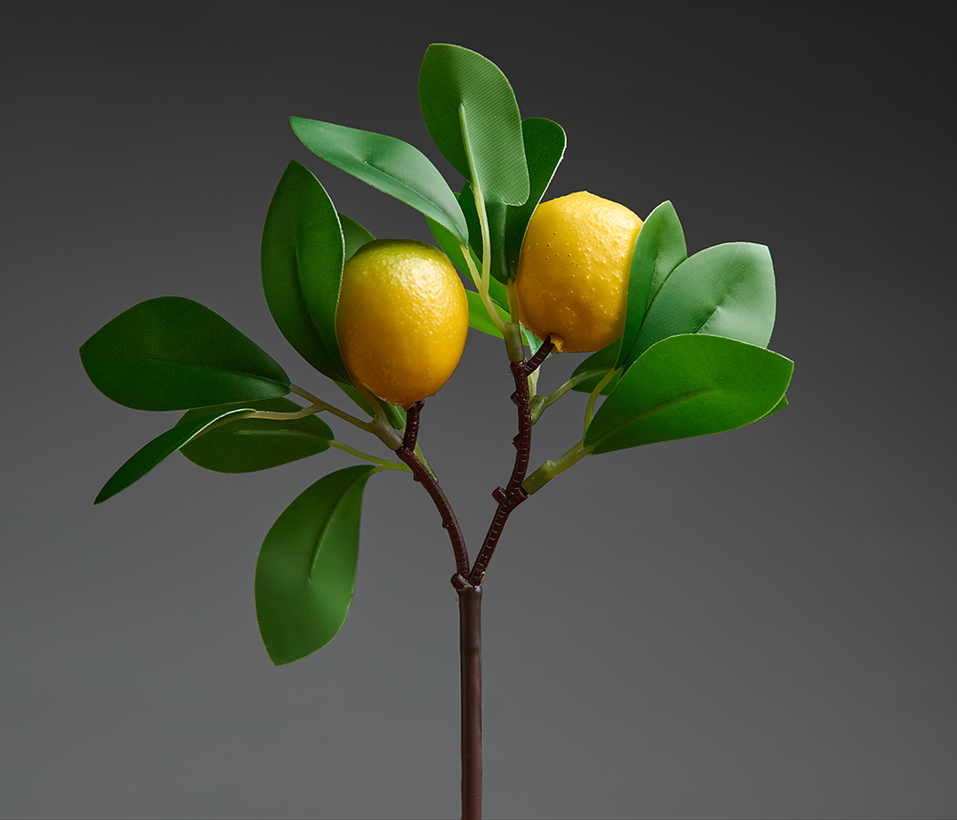Ветка декоративная с плодами Лимона и листьями (плоды D4 см), 30 см, 1 шт., желтый