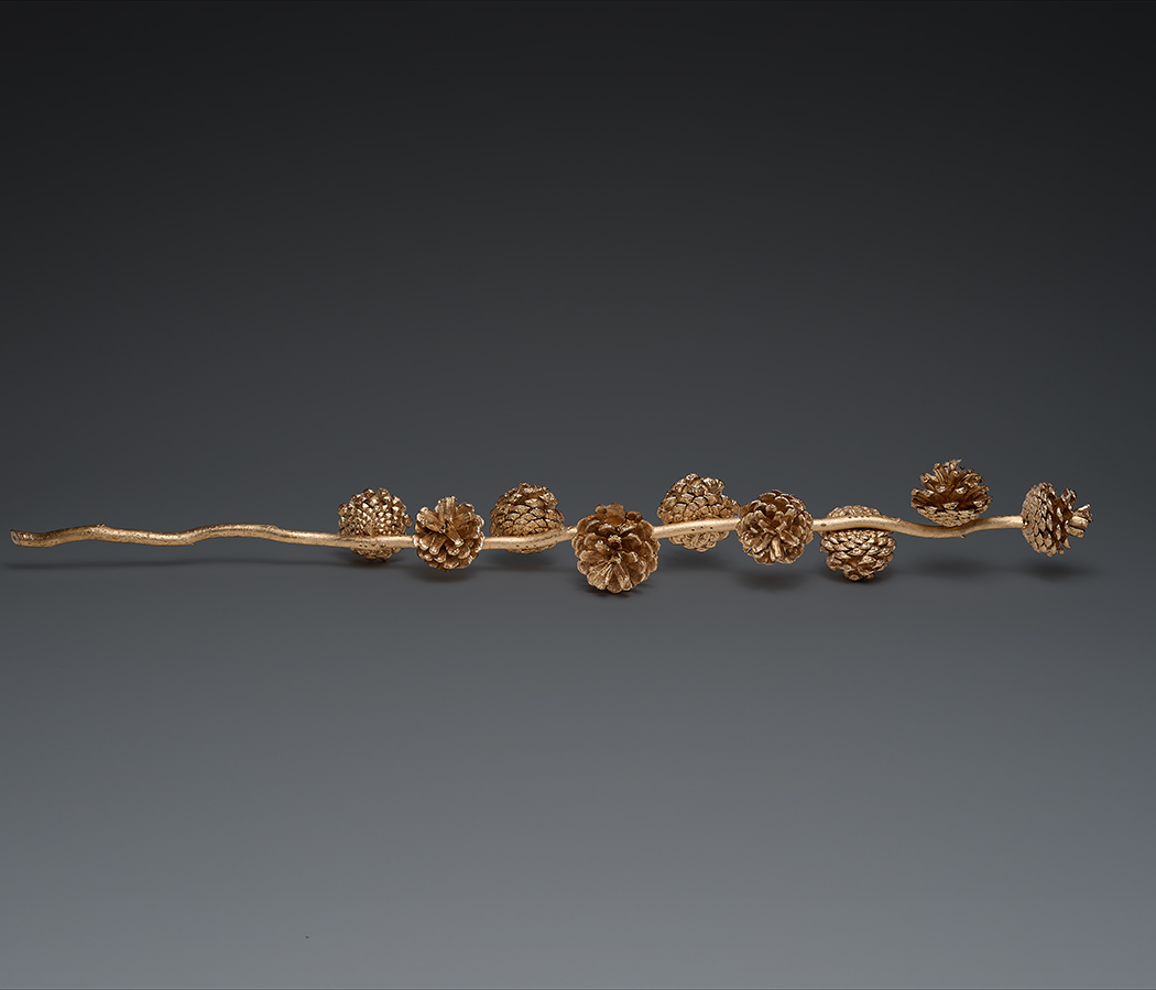 Декоративная ивовая ветка с сосновыми шишками 5-7 см (9шт), 85 см, золото