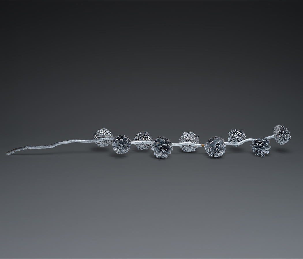 Декоративная ивовая ветка с сосновыми шишками 5-7 см (9шт), 85 см, серебро