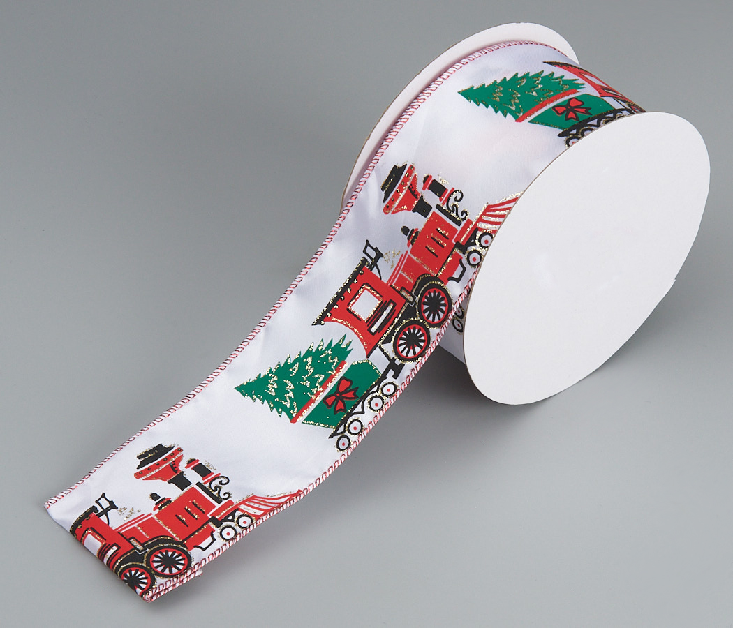 Лента новогодняя декоративная Паровоз с елочкой 6,3*10 ярд, 1 шт., шампань/зеленый/красный