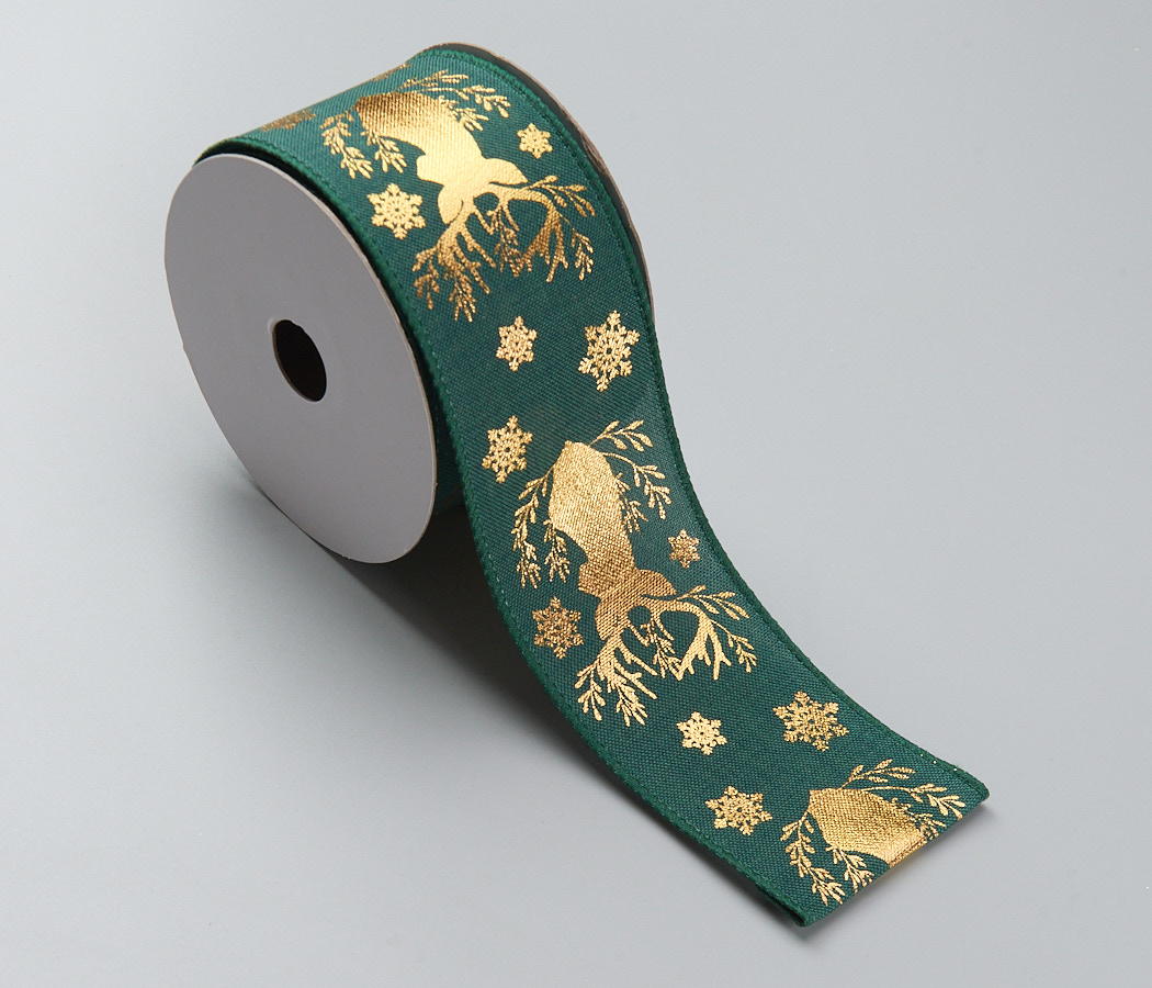 Лента новогодняя декоративная Олени 6,3*10 ярд, 1 шт., зеленый/золотой