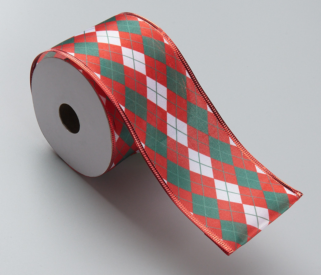 Лента новогодняя декоративная Цветные ромбы 6,3*10 ярд, 1 шт., красный/белый/зеленый
