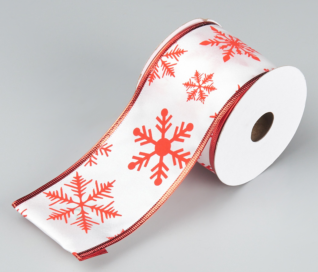 Лента новогодняя декоративная со снежинками 6,3*10 ярд, 1 шт., белый/красный
