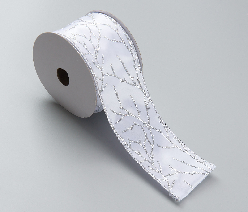 Лента новогодняя декоративная Веточка в снегу 6,3*10 ярд, 1 шт., белый/серебро