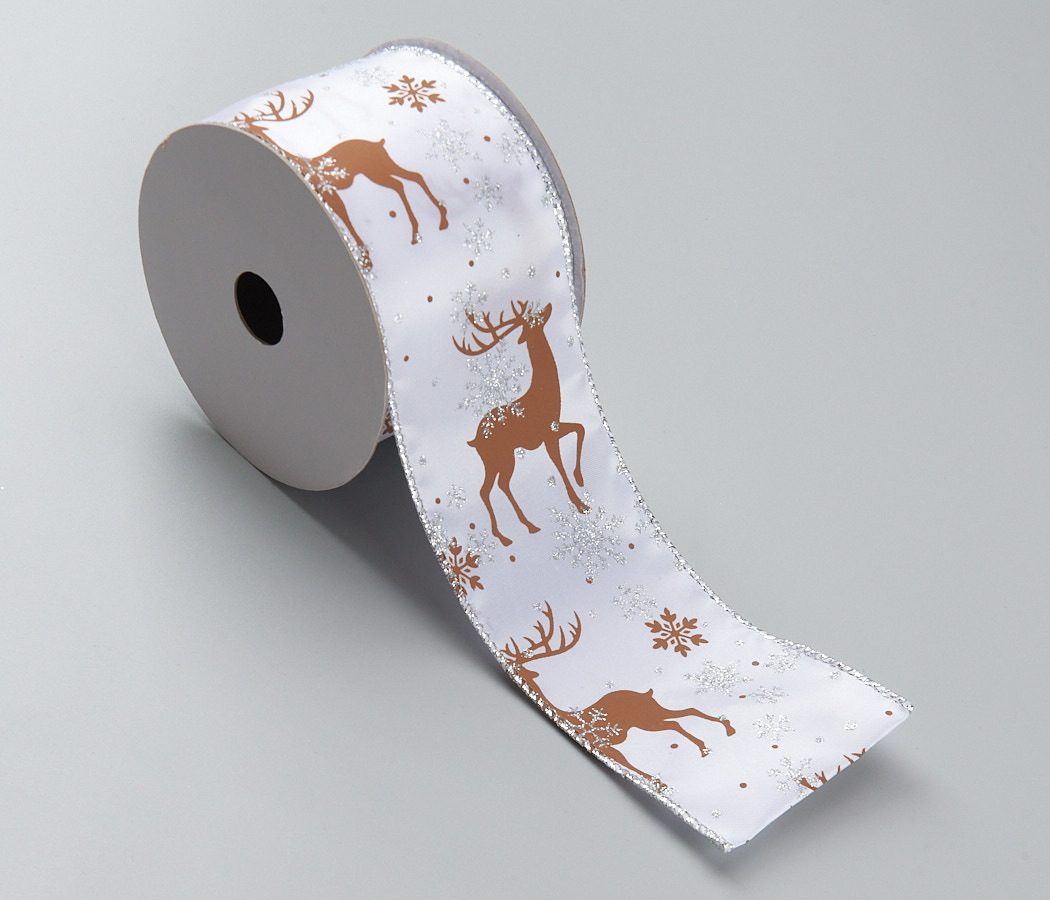 Лента новогодняя декоративная Рождественские олени 6,3*10 ярд, 1 шт., белый/серебро/золото