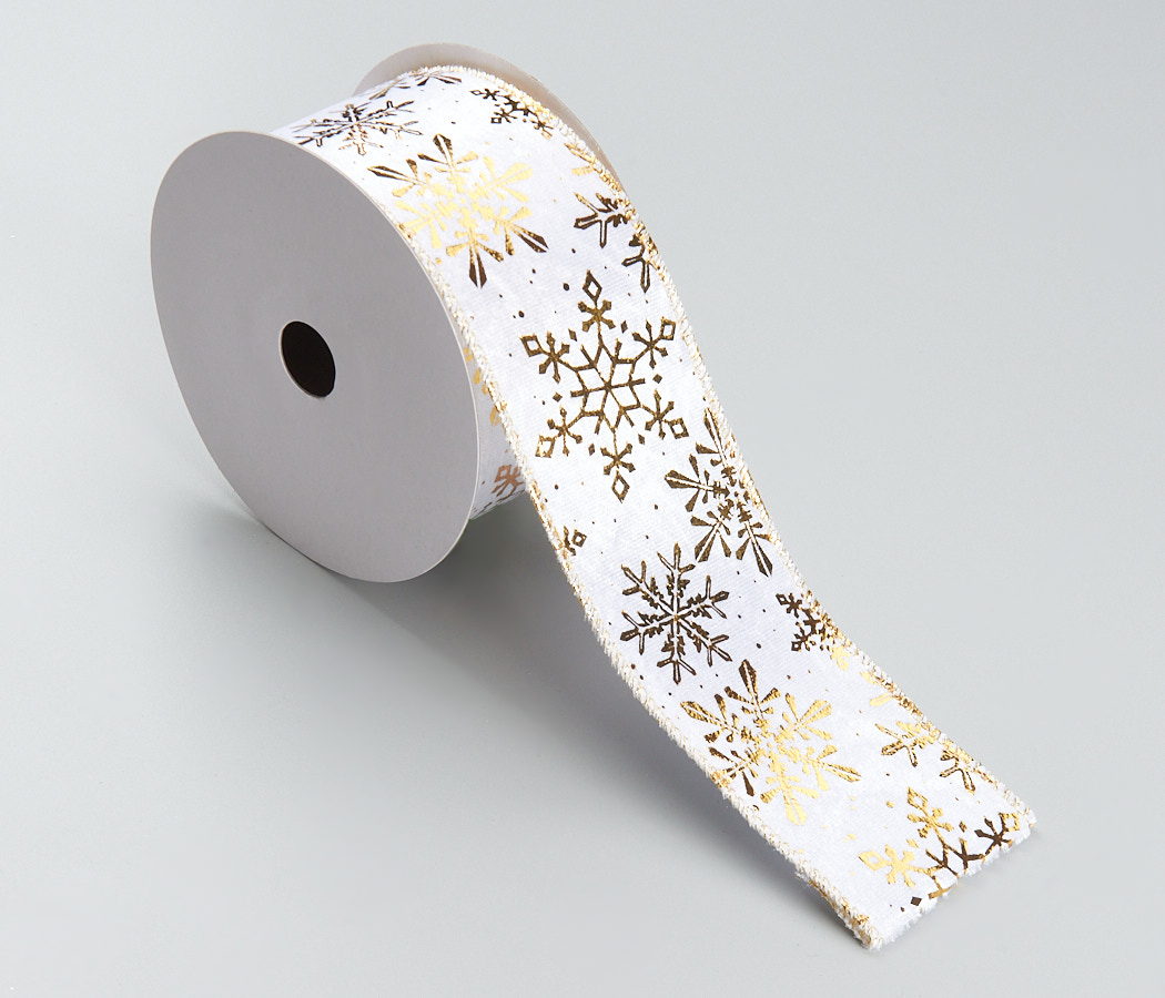 Лента новогодняя декоративная Снежинки 6,3*10 ярд, 1 шт., белый/золото