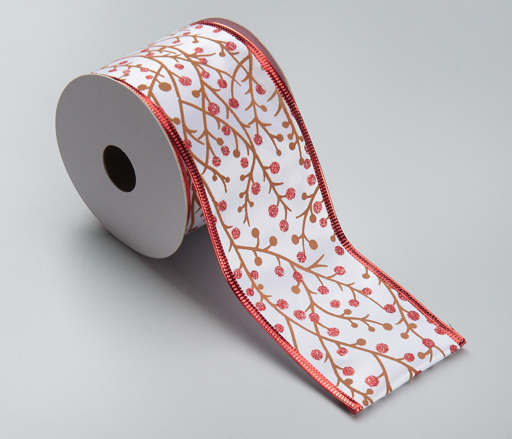 Лента новогодняя декоративная Веточка с ягодами 6,3*10 ярд, 1 шт., белый/красный