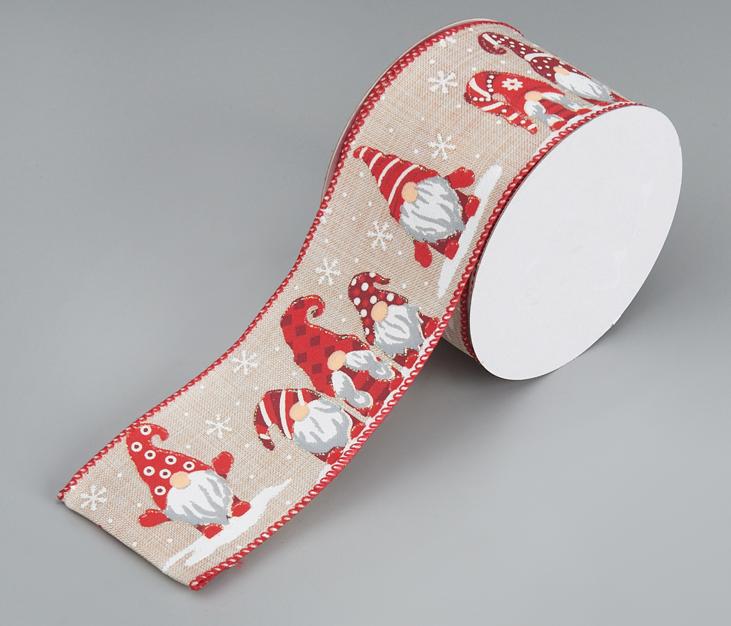 Лента новогодняя декоративная Рождественские гномы 6,3*10 ярд, 1 шт., красный/зеленый