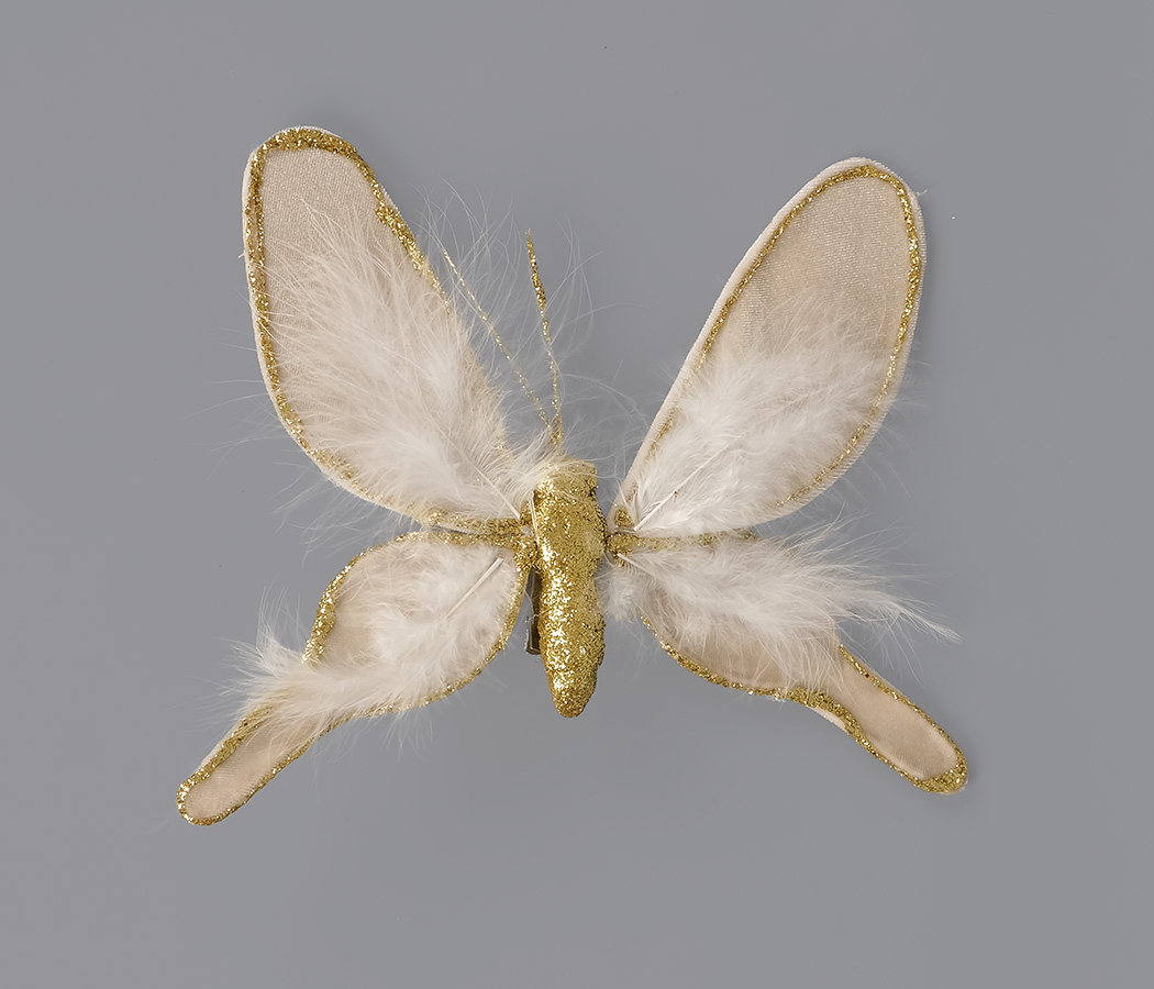 Декоративная новогодняя бабочка с перьями 20*19*2 см, 1 шт., шампань/золото